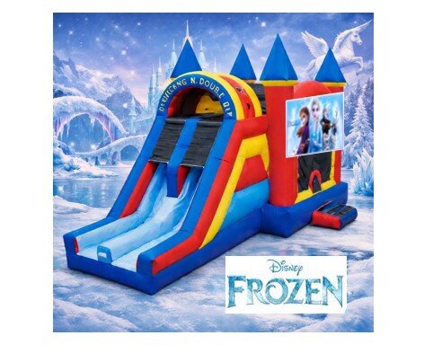 Our Disney Frozen Bounce House & Water Slide Combo is always a favorite amongst little girls ever since the popular movie Disney Frozen came out. They can have a blast with Princess Elsa, Princess Anna, Olaf, Kristoff, Sven, and you can’t leave out the adorable snowman Olaf! If you are planning a Disney Frozen themed birthday party for your little girl, it just won’t be complete without Jump N Fun’s Disney Frozen Bounce House & Water Slide Combo. Your daughter will feel like a real princess in this 18ft. tall, 40 ft. in length, and 15ft. in width giant Disney Frozen castle. Why settle for a boring party when you can have a party full of laughter, fun, jumping, sliding, and splashing? Make your little girl’s dream come true by renting this bounce house and water slide combo for her birthday party. You don’t have to wait until a birthday party to book this gorgeous unit, it’s perfect for a company picnic, school festival, family reunion, church fair, or summer camp.